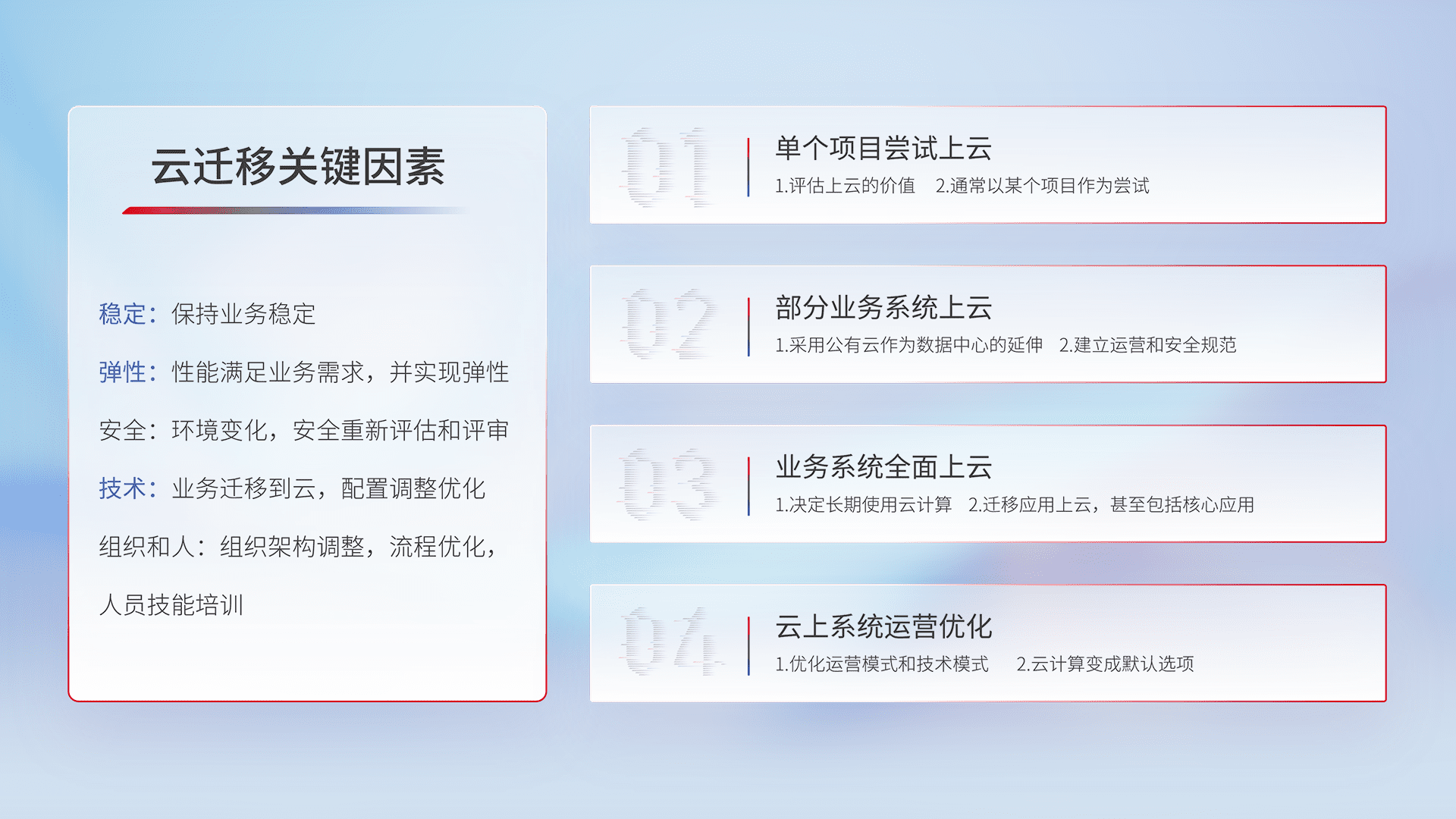 结合实际业务,,从规划设计、、、云平台选型、、云原生改造、、、数据迁移、、集成交付,,,,迁移全过程为客户识别最佳上云路径,,,,做好风险识别管理,,设计网络架构、、、身份权限、、、安全审计合规、、、、操作审计、、、、日志审计、、、、监控告警策略、、、多站点容灾设计等,,,,对云上基础设施进行整体规划,,,提升IT治理水平,,以满足弹性、、、、高可用、、、高性能的需求。。