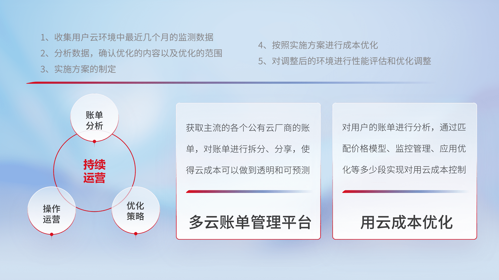 通过多云纳管,,,以统一的资源数据模型把客户的云资源进行抽象和封装,,进而实现对多云资源的统一操作,,,保障云资源管理的可靠性、、稳定性与可用性。。。量身定制化运维内容,,,,配置、、、开发运维、、、补丁管理、、、备份、、、监控、、、认证和访问管理、、审计和日常巡检等,,,保障在用云过程中的可靠度,,,稳定度以及高可用率。。。。